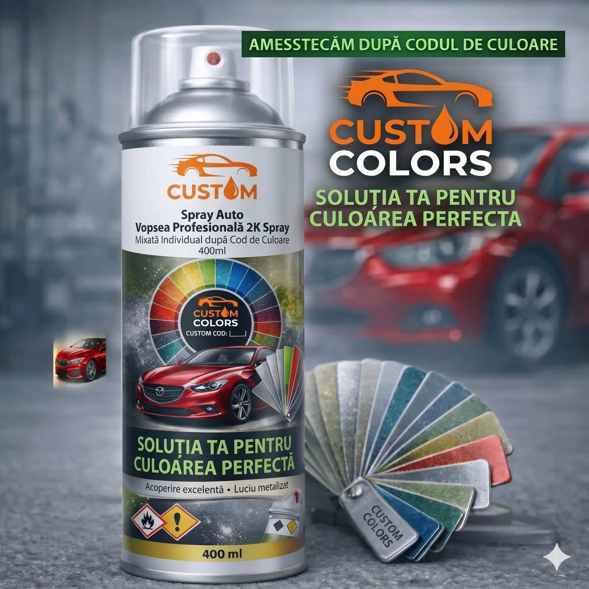 Spray Vopsea Auto Profesională 2K CustomColors – Luciu Direct (Preparată la Cod Culoare), 400ml